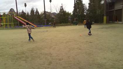 昼休みの様子です。給食を食べて元気いっぱいの子どもたち。1年生は転がしドッジボール、5年生はスキップボールやバトミントンで遊んでいました。