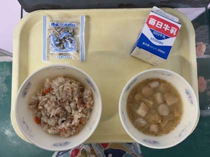 今日は、災害が起こった時のために、学校で保管している非常食を使った献立です。