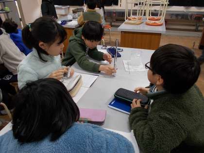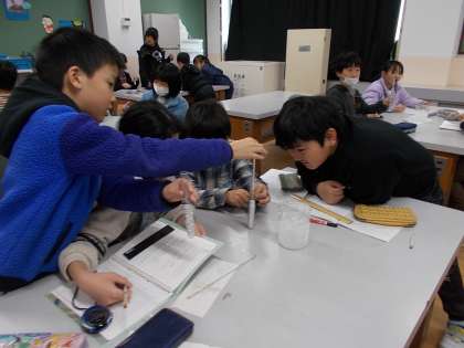 理科の実験の様子です。ビーカーの氷の中に入れた試験管の水の温度や様子の変化について調べています。