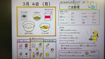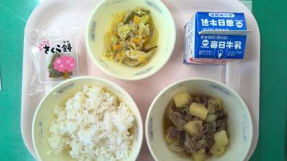 ほっこり美味しい肉じゃが。米酢などや砂糖などでさっぱり味つけをしたごま酢煮。そして今日は春にちなんだ和菓子の「さくらもち」も登場しました。