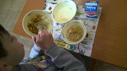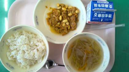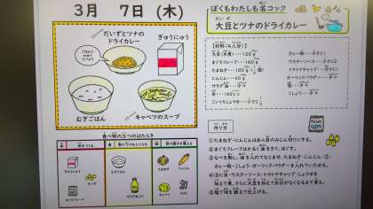 大豆・まぐろフレーク・玉ねぎ・にんじんを使った、「大豆とツナのドライカレー」。ウスターソースやトマトケチャップ、カレー粉などを使って作りました。