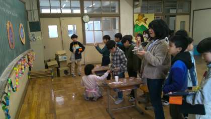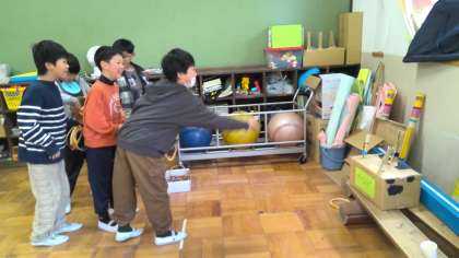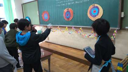 今日の中間休みは、4年生がゲーム屋さんに遊びに来てくれました。ストローアーチェリーや輪投げで楽しく遊んでいました。