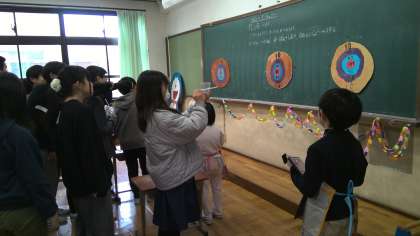 写真3枚目:担任の先生も、ストローアーチェリーに挑戦してくれました!