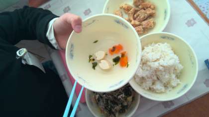 写真中・下:教室をまわっていると、「魚の形のにんじんを見つけたよ!」「このにんじん、リボンの形かな?」「魚の形のお豆腐も入っていた!」と見せてくれる人がいました。楽しい給食時間をすごせて良かったですね。