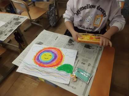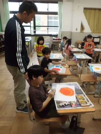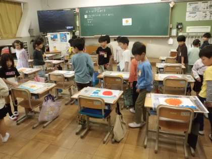 図工の授業の様子です。「ぽかぽかにっこりおひさま」いろいろな色を使ってぬりました。お互いに友達の絵のいいところ見つけています。