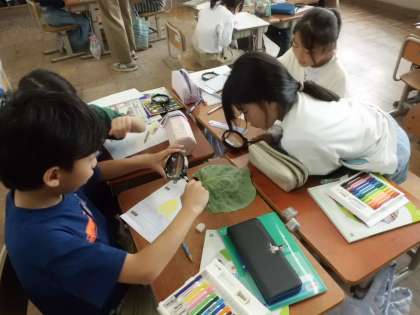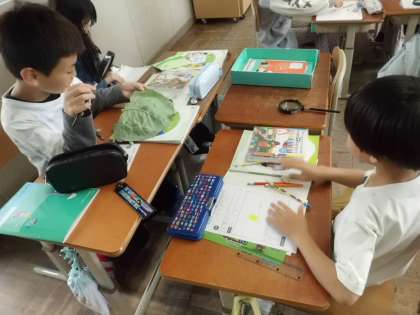 理科の授業の様子です。キャベツの葉に産みつけられたチョウの卵の観察をしています。