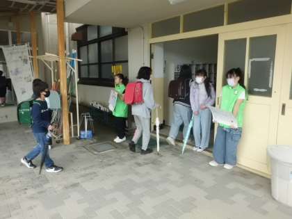 連休明けの登校です。児童会が朝のあいさつをよびかけています。