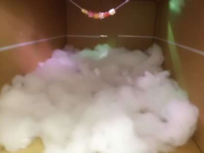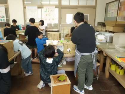 図工の授業の様子です。箱の中に思い思いの空間を作っています。