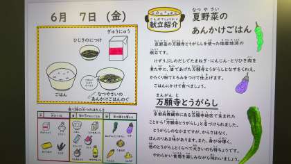 「夏野菜のあんかけごはんの具」は、削り節の出汁で玉ねぎ・にんじん・とりひき肉を煮た中に、万願寺とうがらしとなすを加え、片栗粉でとろみをつけて仕上げています。ごはんにかけていただきました。