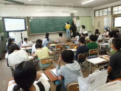 算数の授業の様子です。分数の計算でも「計算の法則」が成り立つか確かめています。