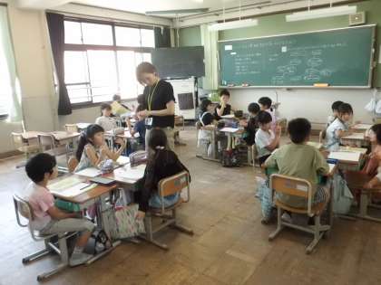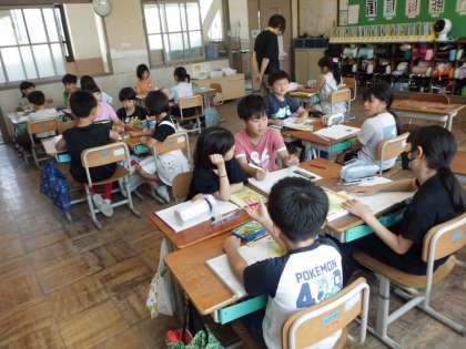 社会科の授業で、スーパーで働く人がどんな工夫をしているかグループで考えています。