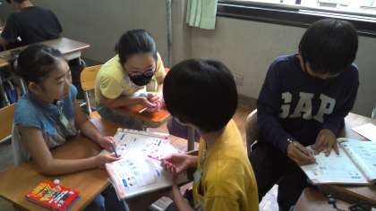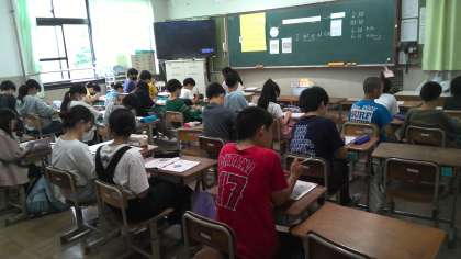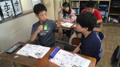 外国語の授業の様子です。「What time do you get up?」「I get up at〇〇.」などの表現を使って、たずね合う学習をしました。