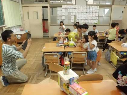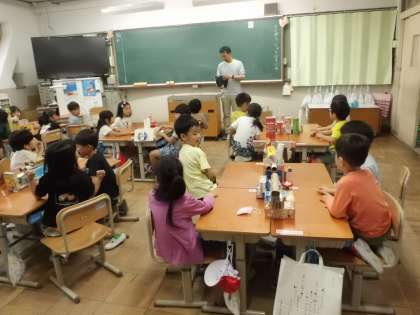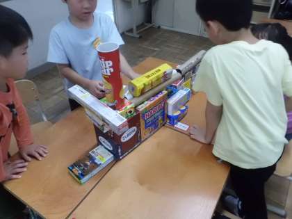 図工の授業の様子です。いろいろな箱を使ってグループで形を作っています。