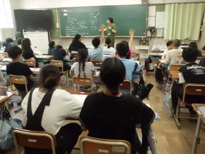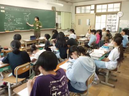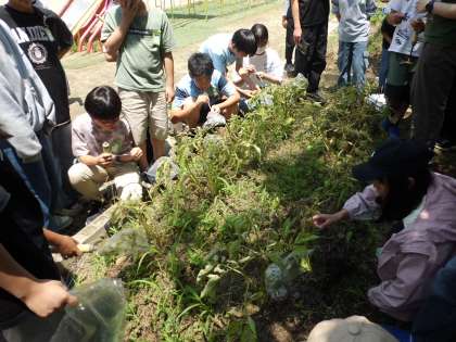 理科の授業で、植物はどのような気体の出入りを行っているか学習しています。学校園に植えたジャガイモで実際に実験をして調べています。