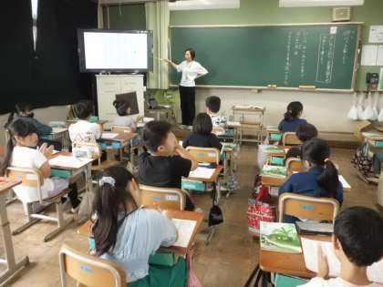 国語『俳句を楽しもう』の授業の様子です。俳句を声を出して読み、ことばの調子やひびきを感じ取っています。