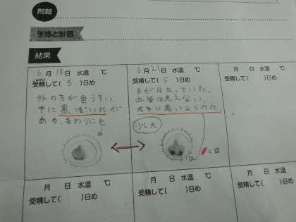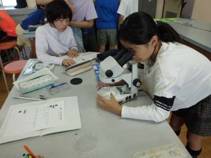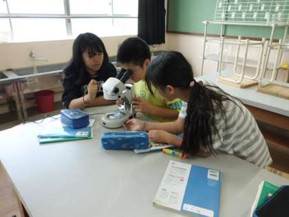 理科の授業の様子です。顕微鏡で藻に産み付けられたメダカの卵の様子について観察しています。