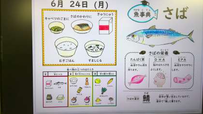 今日の給食ではさばが登場しました。さばは背中が青い色をしているので、漢字で「鯖󠄀」と書きます。さばには、たんぱく質やDHAやEPAが含まれます。味はいかがでしたか?