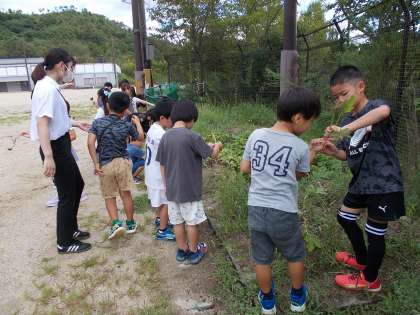 せいかつの授業の様子です。オクラの種をとったり、サツマイモのまわりの草引きをしています。