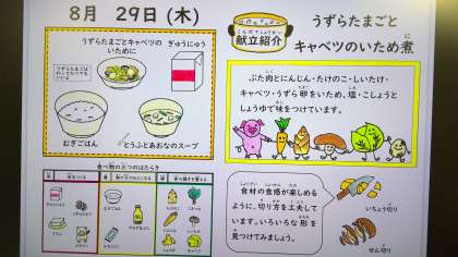 「うずら卵とキャベツの炒め煮」は、豚肉とにんじん・たけのこ・しいたけ・キャベツ・うずら卵を炒め、塩・こしょう・しょうゆで味をつけています。