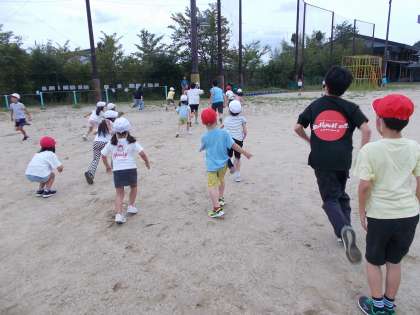 1年生と6年生が「だるまさんがころんだ」をして遊んでいます。