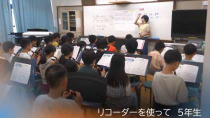 音楽室からきれいな音色が聞こえてきました。のぞいてみると、5年生がリコーダーをふいていました。