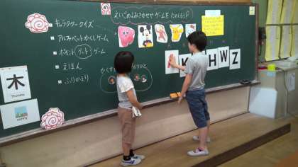 外国語活動の授業の様子です。授業の前半では、1学期でも慣れ親しんだアルファベットについて復習しました。授業後半では、初めて取り組むゲームを通して、楽しみながら英語を話したり聞いたりすることが出来ました。