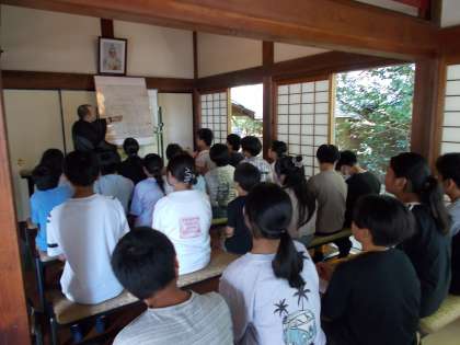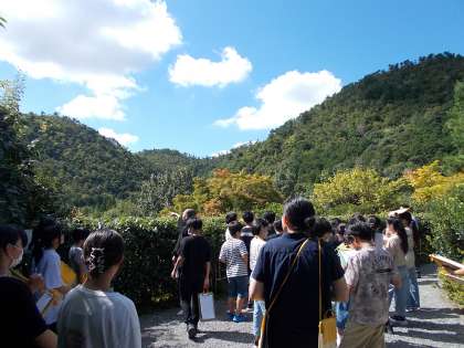 今日は、光悦寺で副住職さんに、校歌でも歌われている本阿弥光悦の人となりとこの鷹峯でどのような役割を果たされてたのかお話をうかがいました。また、鷹峯三山を望む自然豊かな庭も案内していただきました。