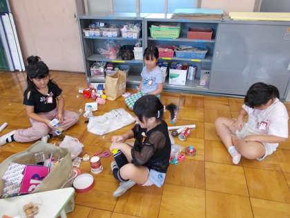 せいかつ『あそんで ためして くふうして』の授業の様子です。身のまわりのものを使って、おもちゃ作りをしています。