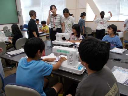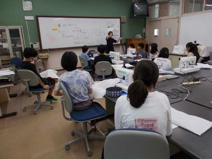 家庭科の授業で、トートバックをミシンを使って縫っています。