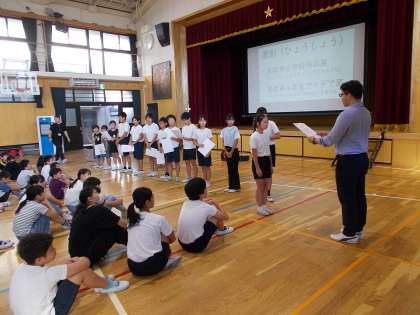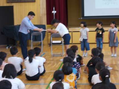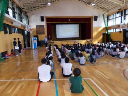 校長先生から、『1年の折り返し点です。これからは与えてもらうやってもらうだけでなく、人とのかかわりで学びになったな、よかったなと思うことを積み重ねてほしい。10月は、スポーツフェスティバルなどおおきな行事があります、みんなの頑張りといきごみを見せてほしい。校長室の前にふくろをおいておきますので、がんばりたいと思うことをカードに書いて入れておいてください。」とお話がありました。