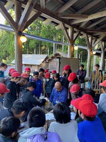 火おこし、どのようにするのか、まずは教職員が挑戦しました。