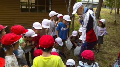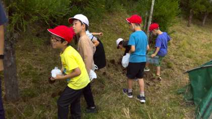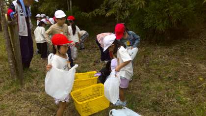 1年生が、山で栗拾いをしました。楽しく拾っていました。