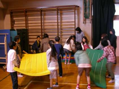 児童集会の後,5年生が力を合わせて倉庫からマットを出しています。体育学習の単元計画に合わせ,使いやすいように整備をしています。