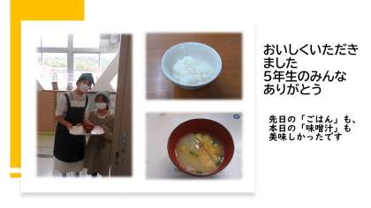 5年生が家庭科の調理実習の成果を教えにきてくれました。先日はごはんを、本日は味噌汁をいただきました。