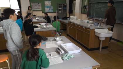 理科の授業で、水や空気が温度によって体積がどのように変わるか実験で調べています。