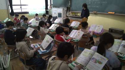 音楽の授業の様子です。鍵盤ハーモニカで『子ぎつね』『こぐまの二月』などの曲を演奏していました。