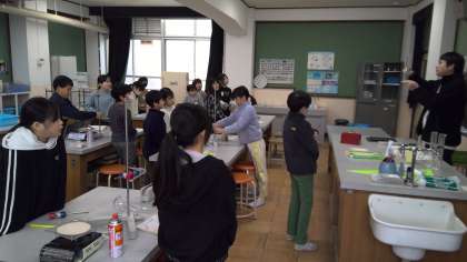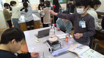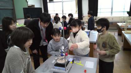 理科の授業で、水が温度の変化によってどのように姿を変えるかを実験で調べています。