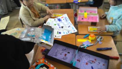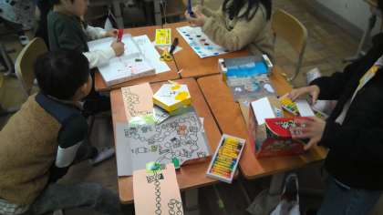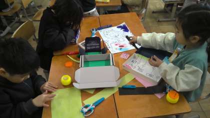 それぞれ「お花」や「空」などテーマを考えてすごろくを作っています。