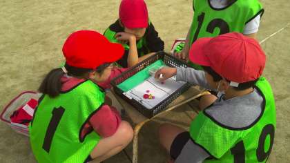 ハーフタイムには互いの動き方について話し合いをしています。