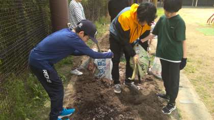 校庭で菜園活動をしていました。牛ふんや肥料をいれて耕しています。