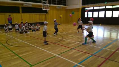 フラフープやボールを使って、いろ鬼をアレンジした新しい遊びを工夫しています。