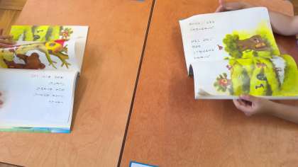 『本に耳をあてて。どうぶつさんたちがなにをおはなししているか、こえがきこえますか?』