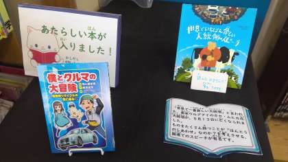 図書館で、学級文庫に置いて、みんなが読んだらいいなと思う本を選んでいます。