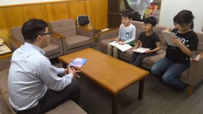 先生が「小学生のころに、夢中になっていたこと」を、インタビューしてメモをとっています。