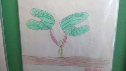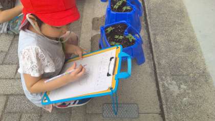 でたばかりの芽や葉のようすを観察ノートにかいています。