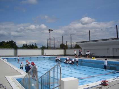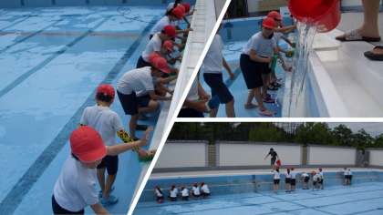 来週5月26日(月)から始まる水泳学習にむけて、6年生がプールの清掃を頑張りました。午後からはお天気も回復し、五月晴れの中