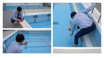 子どもたちが、安心・安全に学習できるように、水温・気温・塩素濃度など色々しらべています。