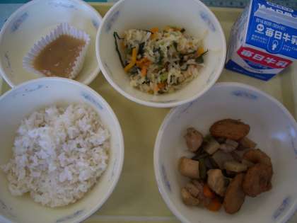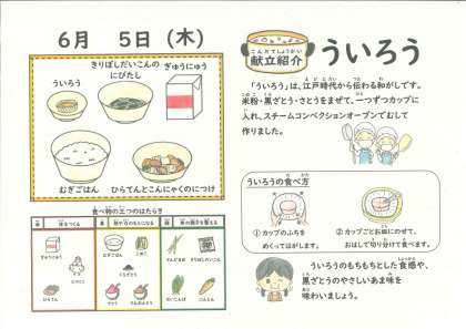 給食の「ういろう」は給食調理員さんが一つ一つカップに入れて、スチームコンベクションオーブンでむして作ってくださっています。