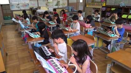 音楽の授業で、うたにあわせてけんばんハーモニカで『ぷっかりクジラ』を吹いています。