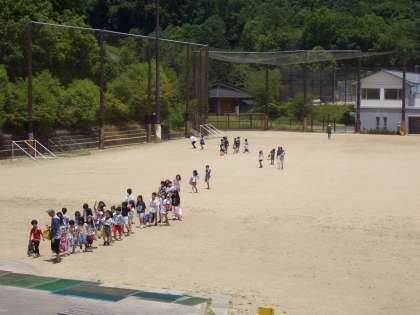 3時間目のプール学習が終わり、校舎に向かう1・2年生。